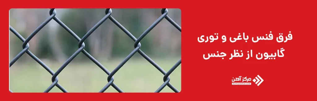 فنس باغی از مفتول های بافته شده است، در حالی که توری گابیون شبکه ای فلزی است که معمولاً با سنگ پر می شود و ساختار محکم تری دارد.