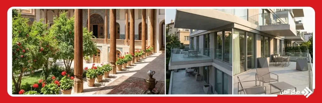 فرق تراس و بالکن و ایوان در اصل به نوع تعریف معماری و جایگاه آن ها در سازه ساختمان باز می گردد. تراس معمولاً یک فضای باز یا نیمه باز وسیع است که می تواند روی بام، طبقات یا حتی هم سطح زمین طراحی شود. بالکن فضایی کوچک تر است که به صورت پیش آمده از نمای ساختمان و متصل به یک واحد مسکونی ساخته می شود. ایوان اما ریشه در معماری سنتی دارد و اغلب فضایی سر پوشیده، عمیق و متصل به بنا است که نقش واسط بین فضای داخلی و خارجی را ایفا می کند. تفاوت های تراس و بالکن و ایوان باعث می شود هر کدام عملکرد و ارزش متفاوتی در طراحی ساختمان داشته باشند. از منظر مقررات شهری نیز این فضاها تعاریف حقوقی متفاوتی دارند که بر سطح اشغال و تراکم اثر می گذارد. همچنین شرایط اقلیمی نقش مهمی در انتخاب تراس، بالکن یا ایوان در طراحی دارد. در نهایت، شناخت این تفاوت ها به تصمیم گیری دقیق تر در خرید، طراحی و بهره برداری ساختمان کمک می کند.