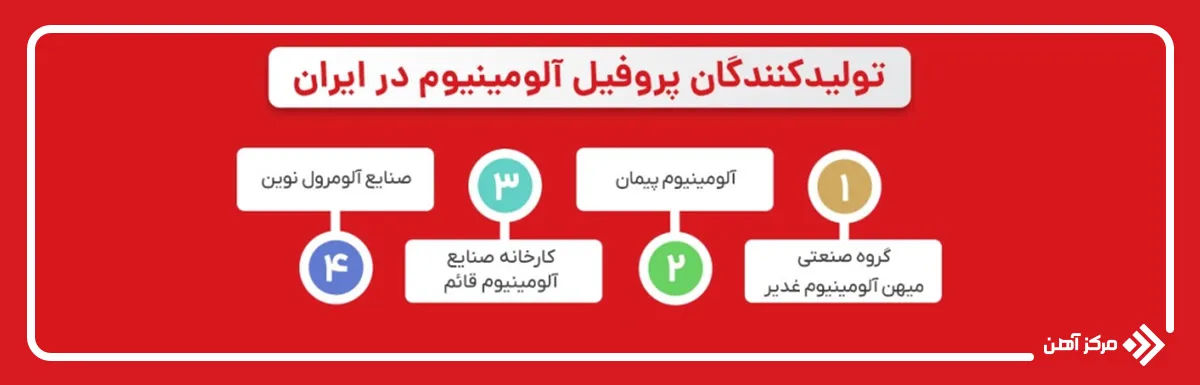 به دلیل محدودیت استفاده از پروفیل آلومینیوم نسبت به پروفیلهای فولادی، تولیدکنندگان کمتری از این محصول در کشور وجود دارد. در ادامه لیست مطرحترین تولیدکنندگان پروفیل آلومینیوم در کشور برای اطلاعات بیشتر شما آورده شده است.همچنین قیمت پروفیل آلومینیوم در سایت مرکزآهن بروز است.