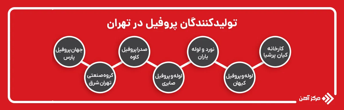 از مهم ترین کارخانه های تهران میتوان به کیان پرشیا، کیهان، صابری، یاران، صدرا پروفیل کاوه، تهران شرق و جهان پروفیل پارس اشاره کرد. این واحدها بخش بزرگی از نیاز بازار پروفیل ساختمانی و صنعتی را تأمین می کنند.