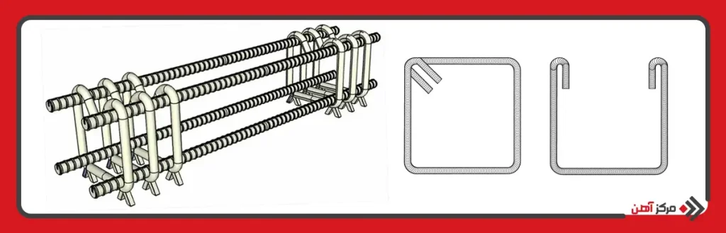 خاموت ها طبق نقشه به شکل بسته با قلاب 135 یا 180 درجه خم شوند تا باز نشوند. طول دم قلاب و شعاع خم مطابق آیین نامه و نقشه رعایت شود و زوایا دقیق کنترل شوند.